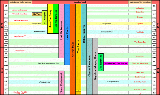 Here is an interesting link which outlines the players in Zappa’s band during 1973 – 1974. Really useful when working out who is playing on bootlegs in particular.
